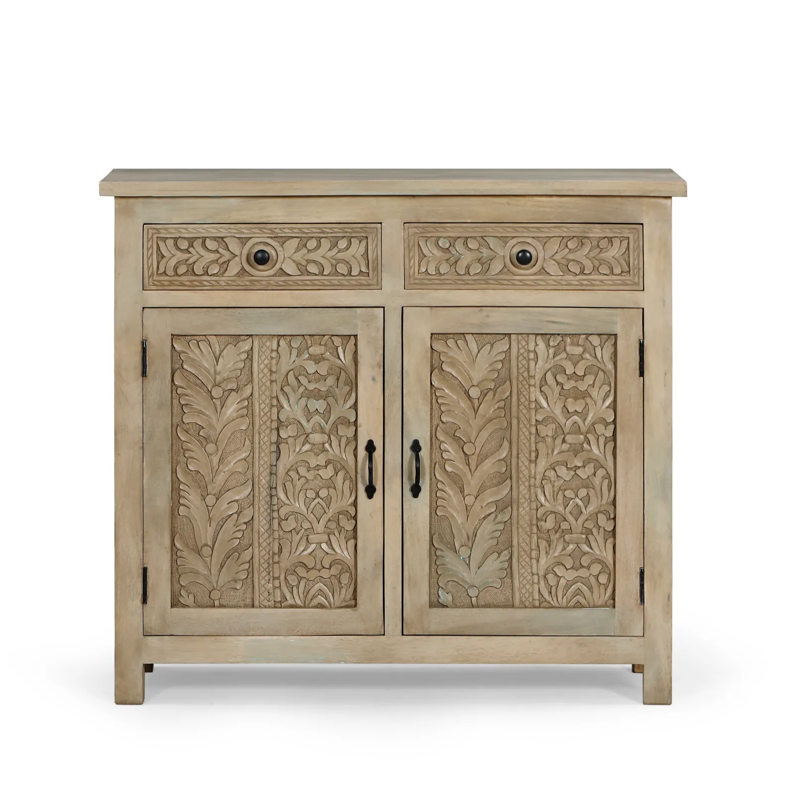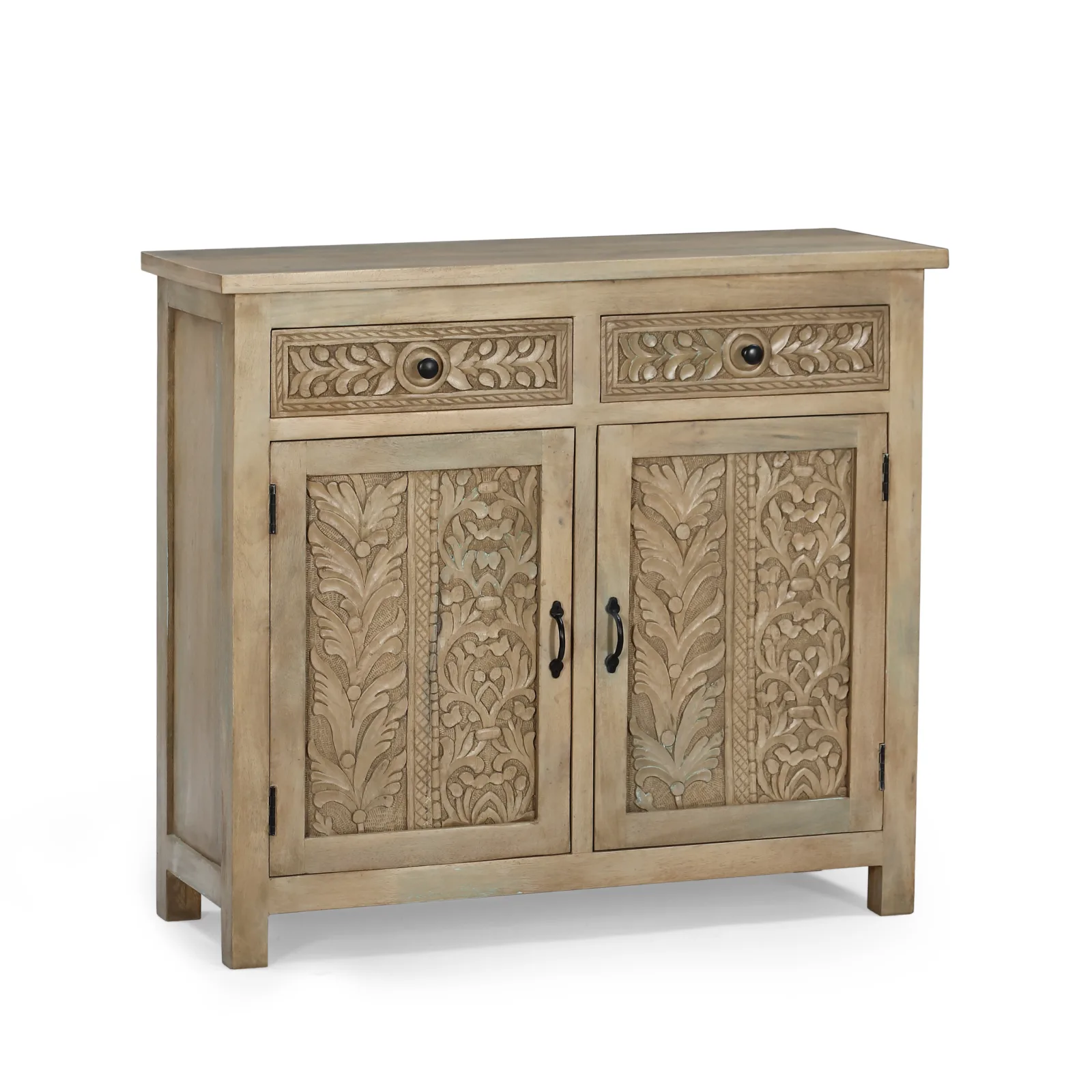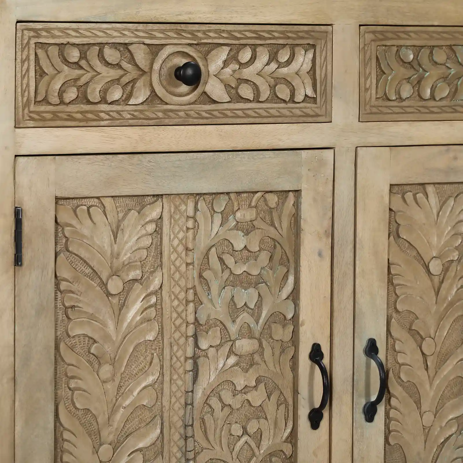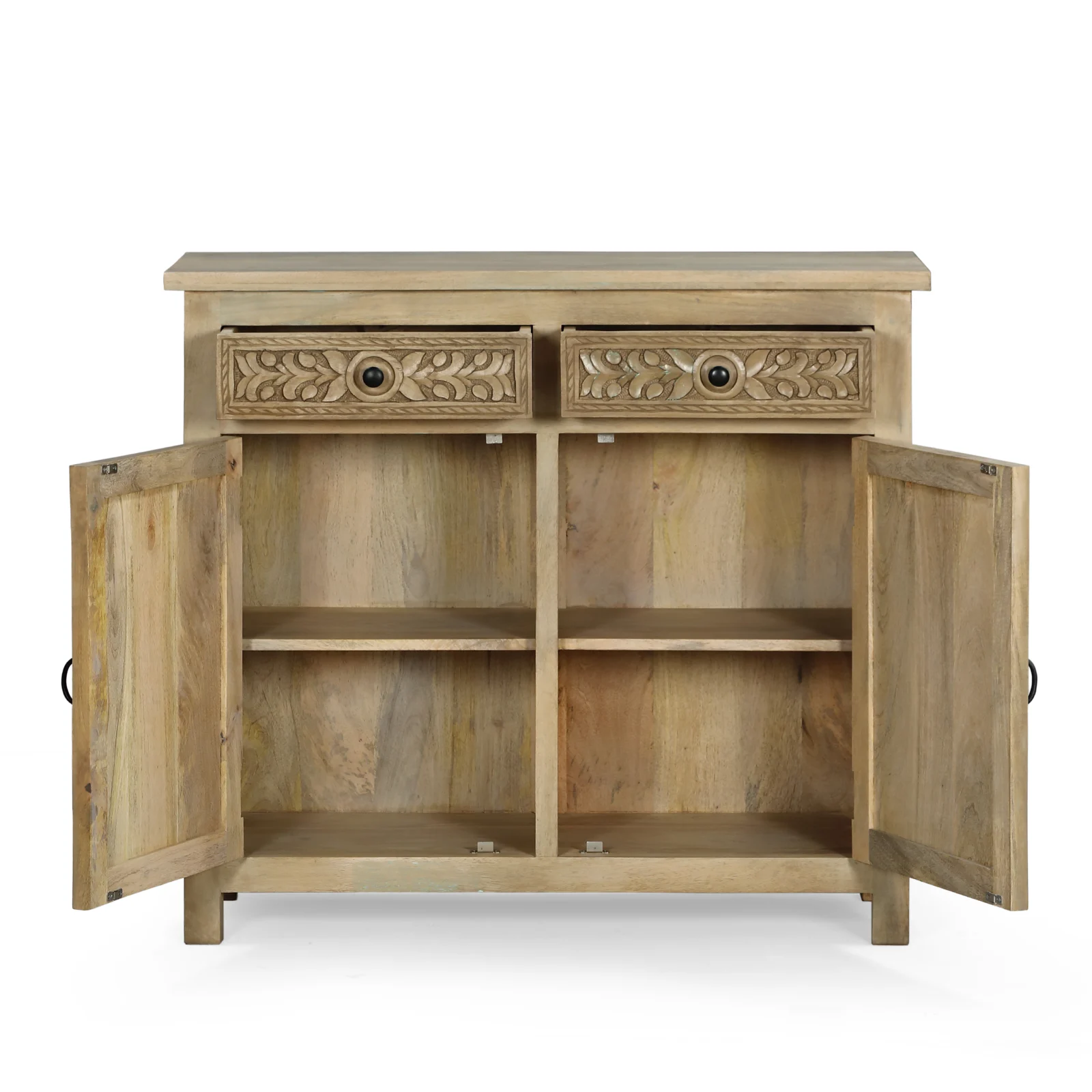 Aparador 105cm Bangalore con 2 puertas y 2 cajones en madera de mango. Destaca por sus tallados de formas naturales y orgánicas realizados a mano. Los tiradores en negro aportan contraste y equilibrio al diseño, mientras que su estructura sólida en madera de mango garantiza su durabilidad.