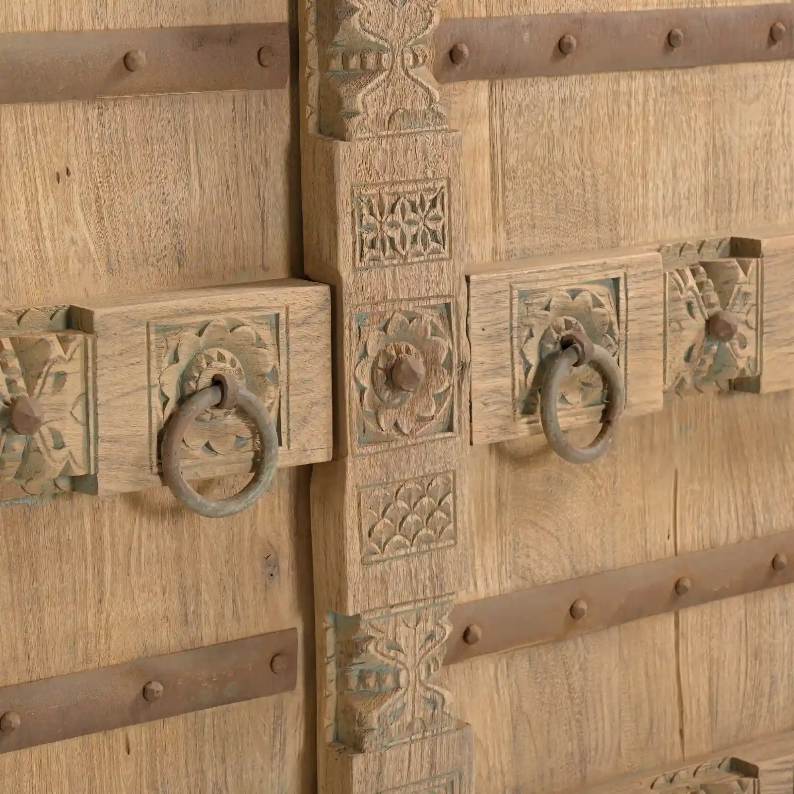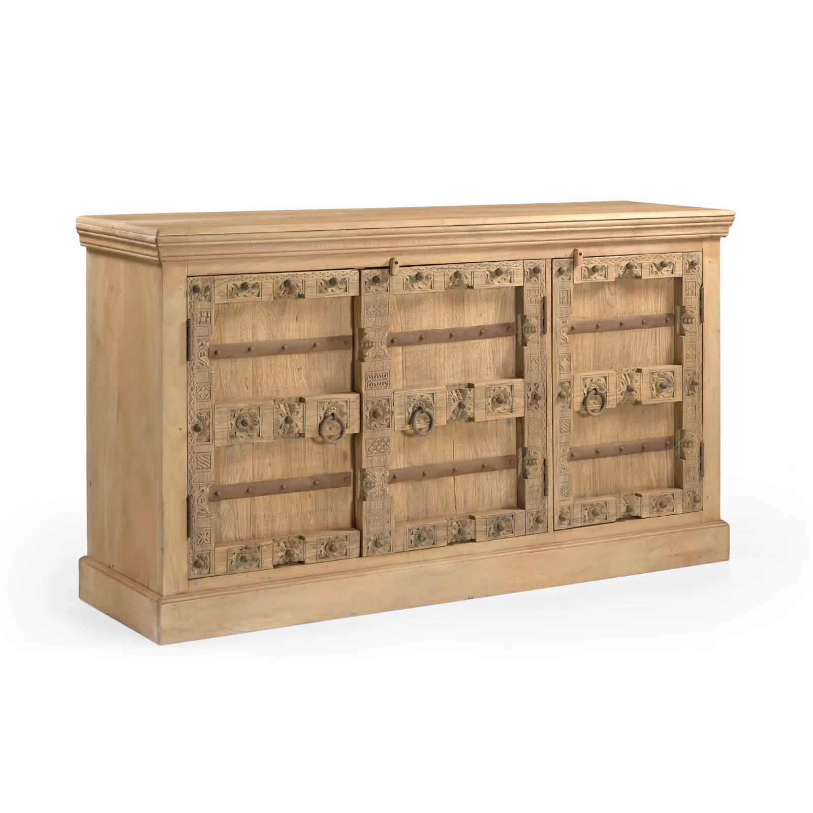 Aparador de madera de mango tallado a mano, realizado a través de puertas antiguas. Cuenta con 3 puertas y baldas en su interior, con acabado "antic".