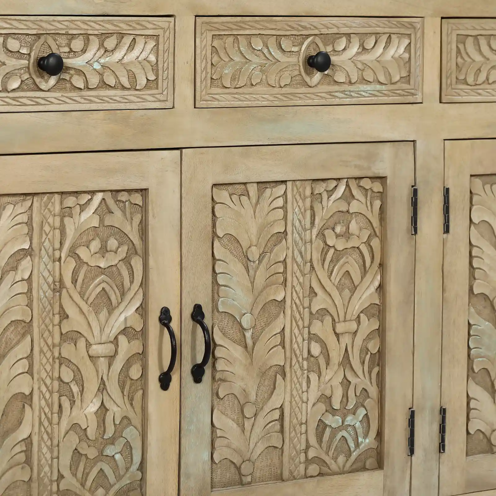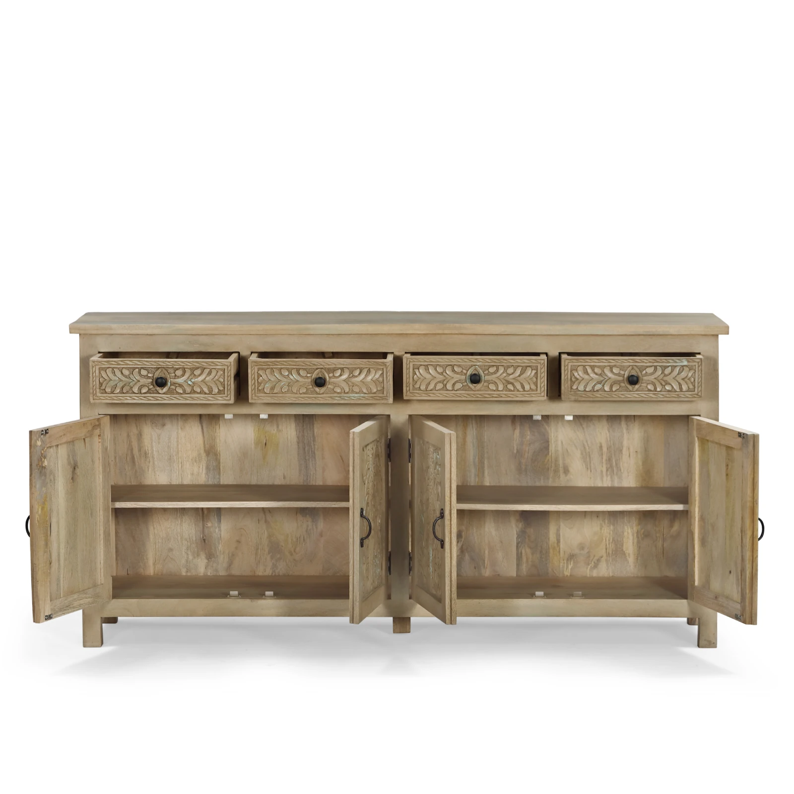 Aparador 180cm Bangalore con 4 puertas y 4 cajones en madera de mango. Destaca por sus tallados de formas naturales y orgánicas realizados a mano. Cuenta con baldas interiores. Los tiradores en negro aportan contraste y equilibrio al diseño, mientras que su estructura sólida en madera de mango garantiza su durabilidad.