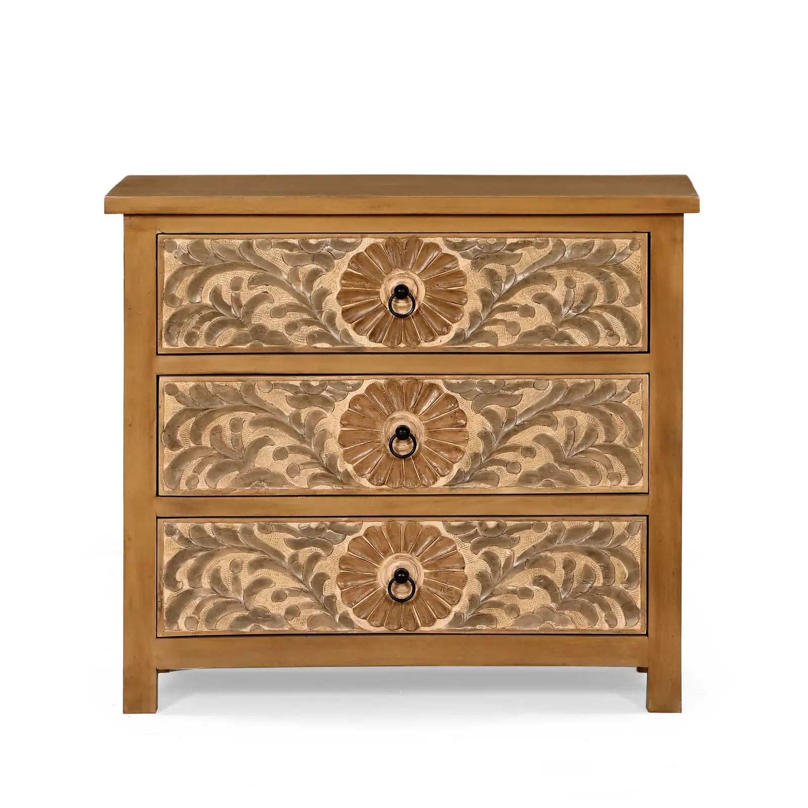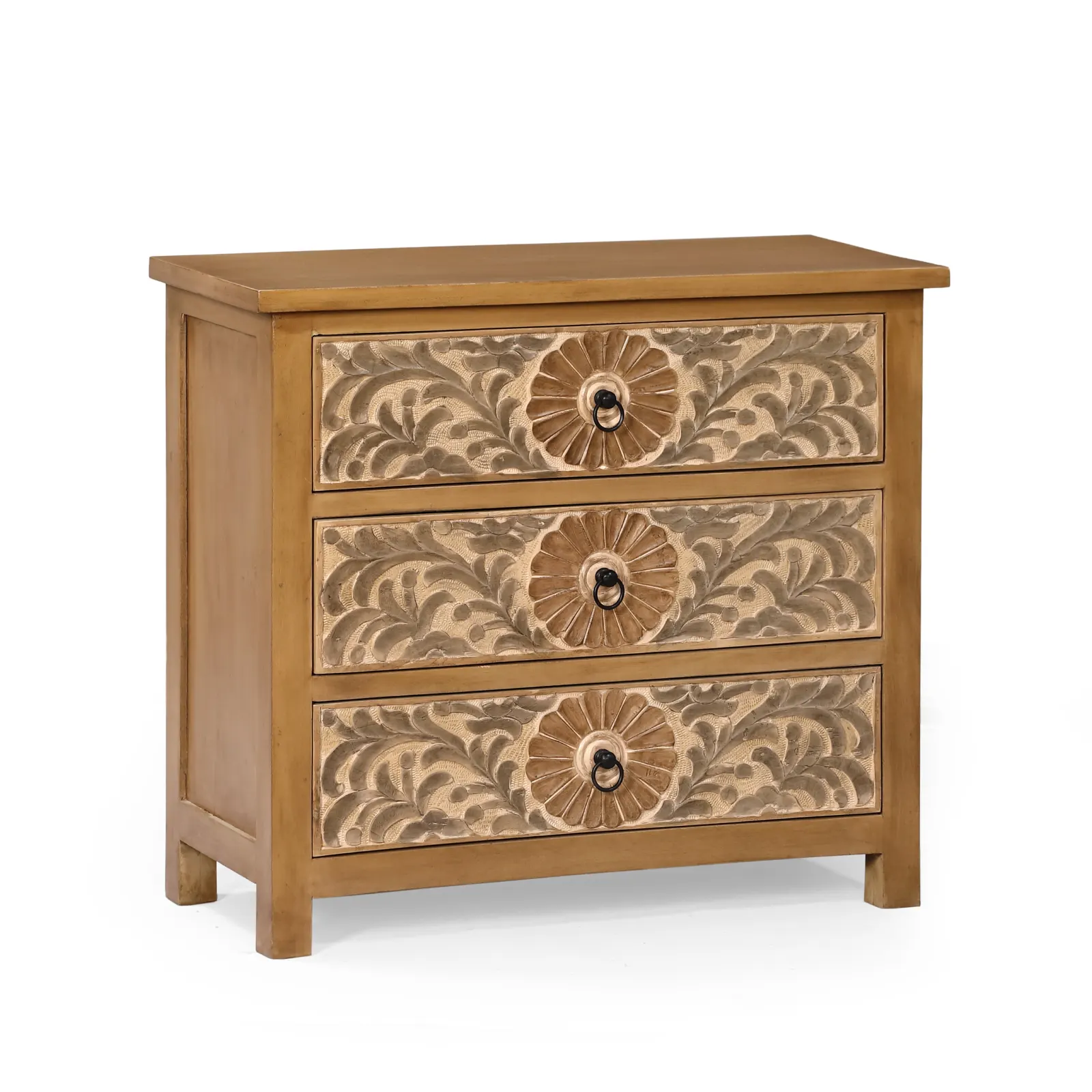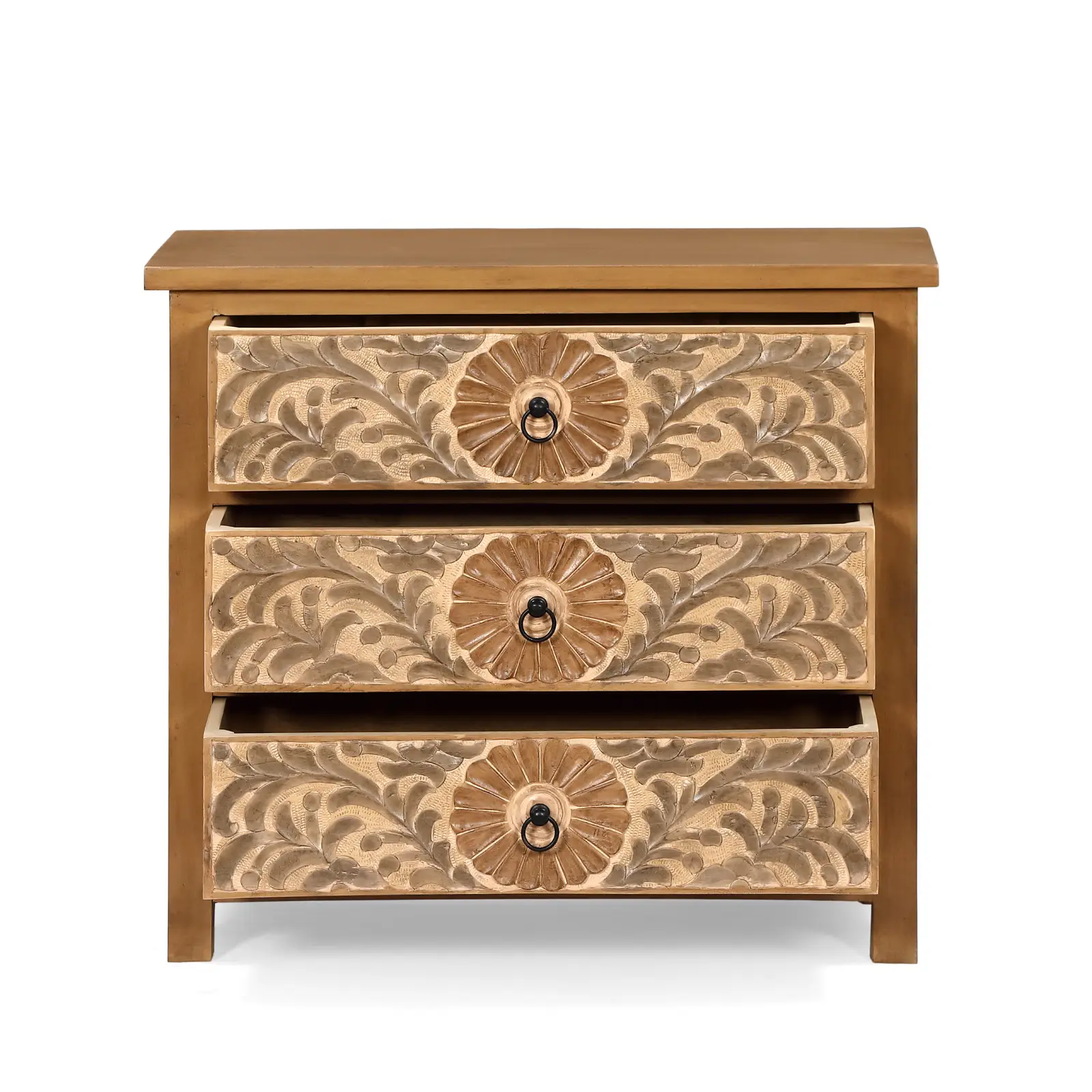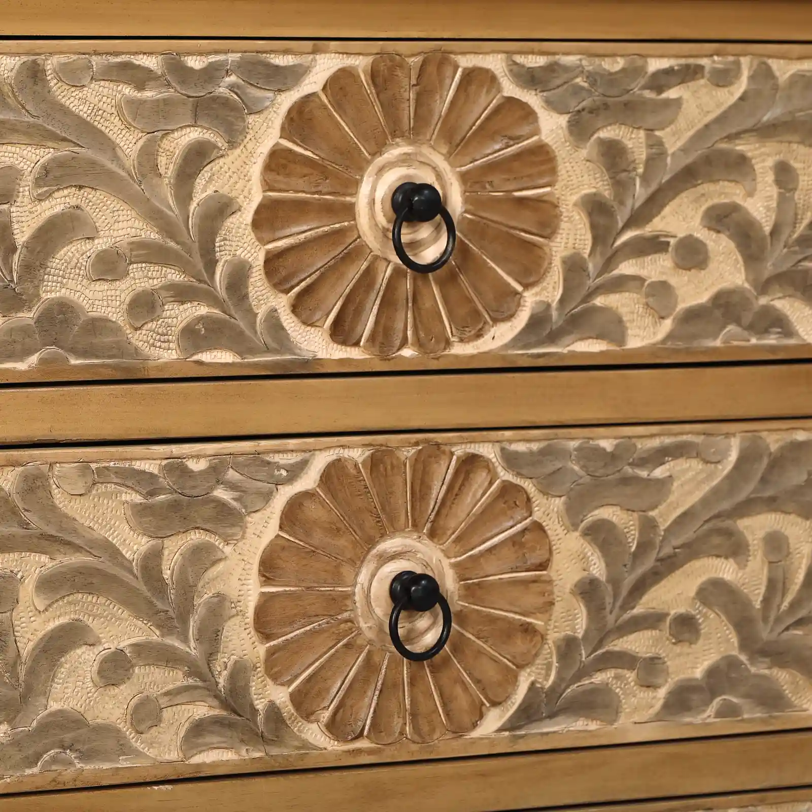 Cómoda Calcuta con 3 cajones en madera de mango. Destaca por sus tallados de formas naturales y orgánicas realizados a mano. Los tiradores en negro aportan contraste y equilibrio al diseño, mientras que su estructura sólida en madera de mango garantiza su durabilidad.
