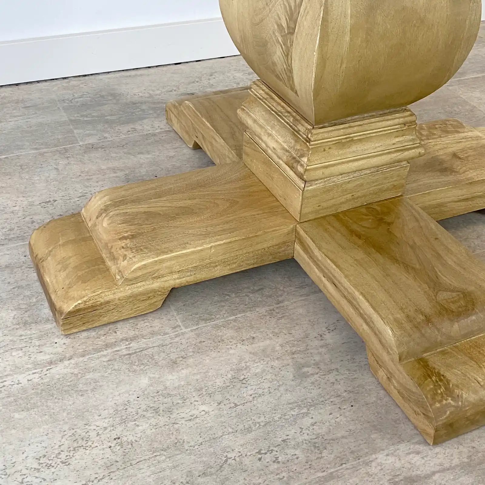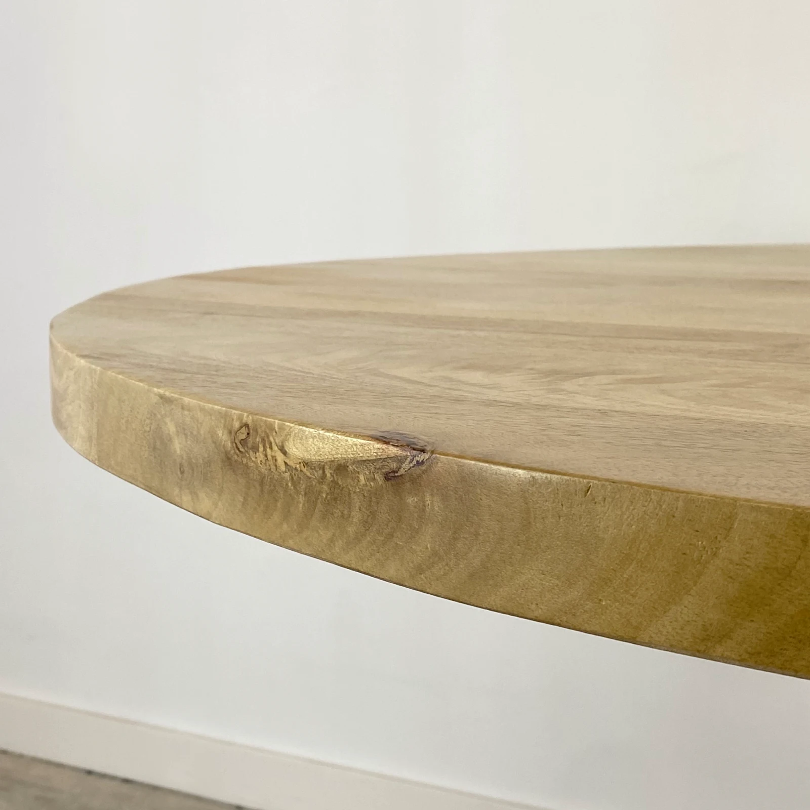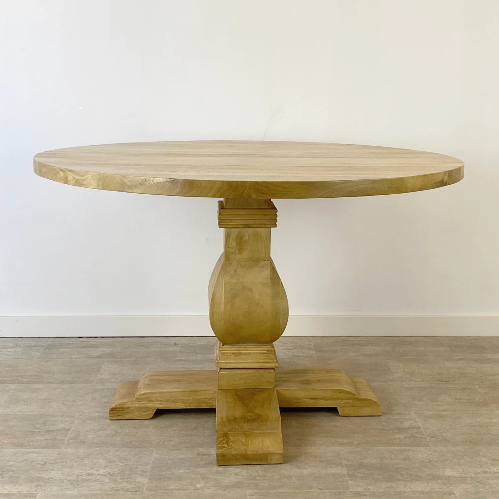 Mesa de comedor redonda de 120cm en madera de mango certificada y sostenible tonalidad natural, con pata central de estilo clásico.