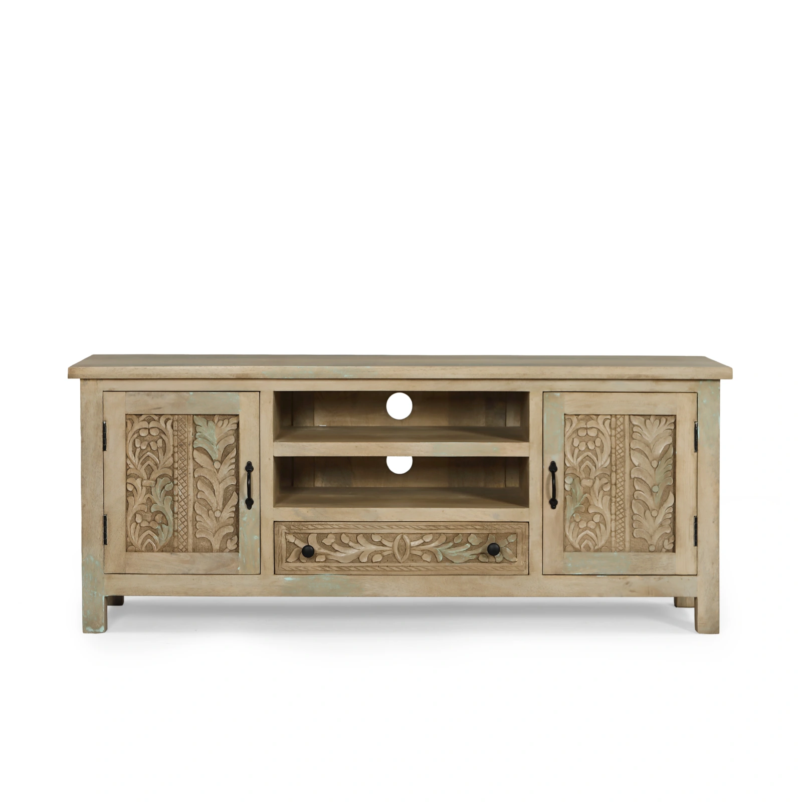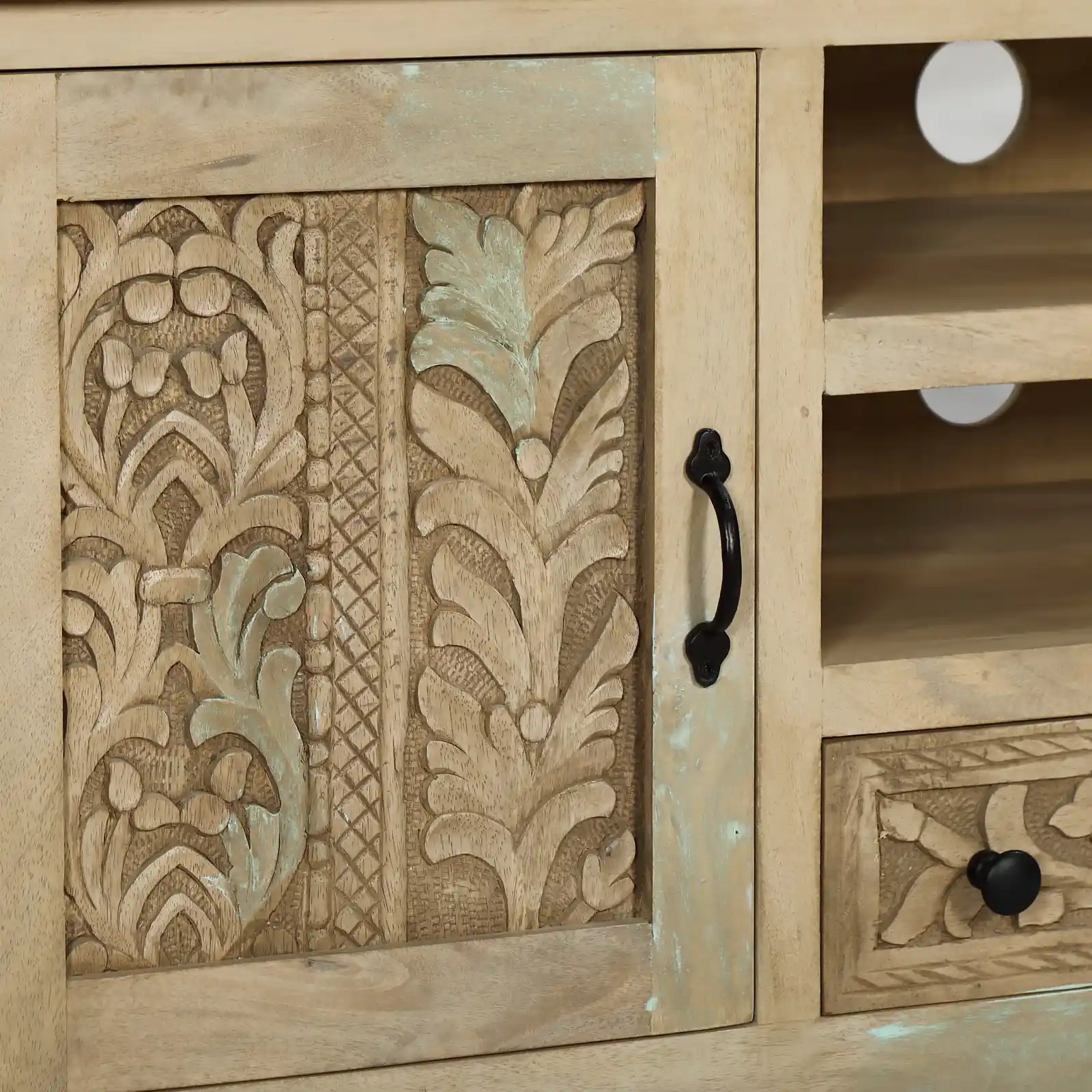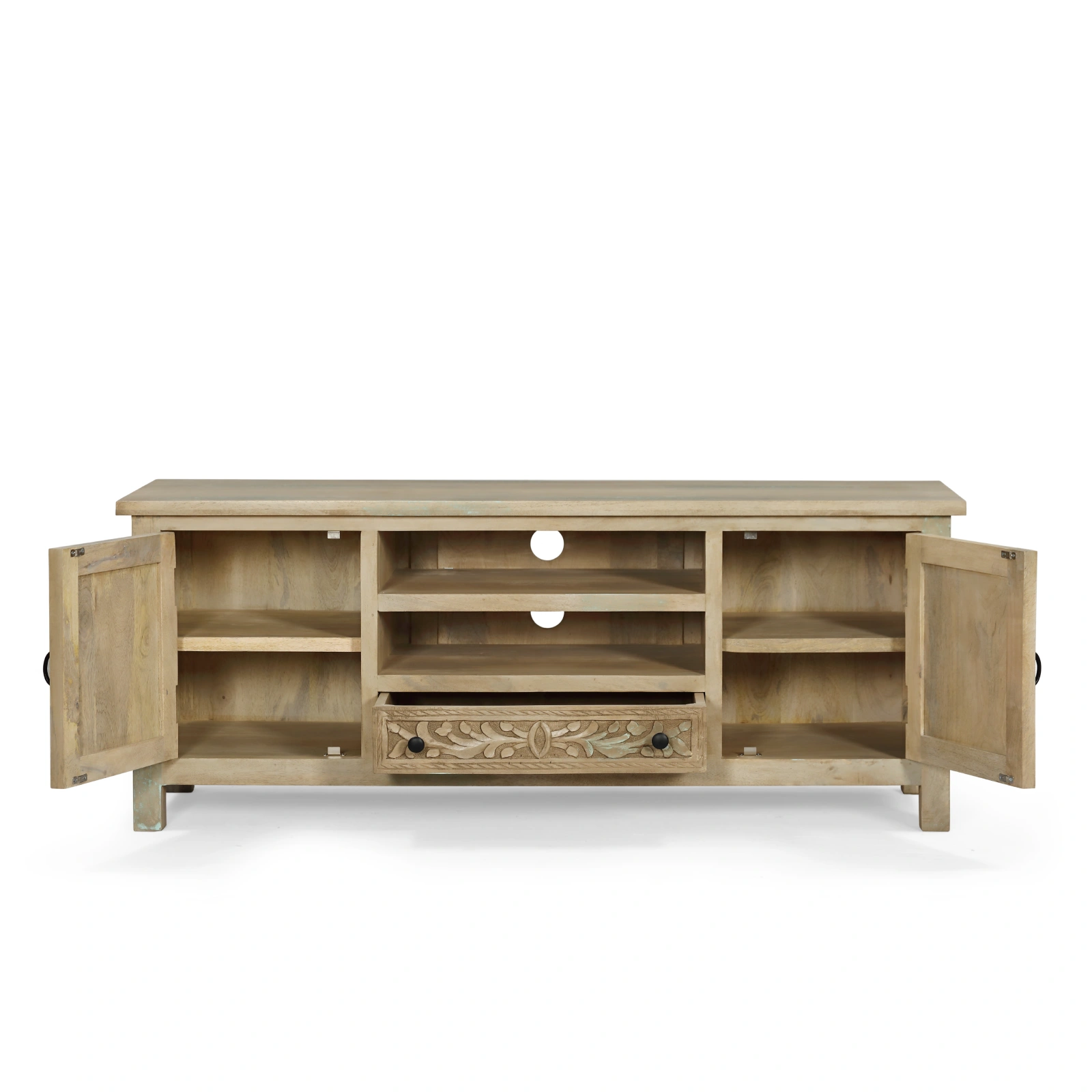 Mueble tv Bangalore con 2 puertas y cajón en madera de mango. Destaca por sus tallados de formas naturales y orgánicas realizados a mano. Los tiradores en negro aportan contraste y equilibrio al diseño, mientras que su estructura sólida en madera de mango garantiza su durabilidad.