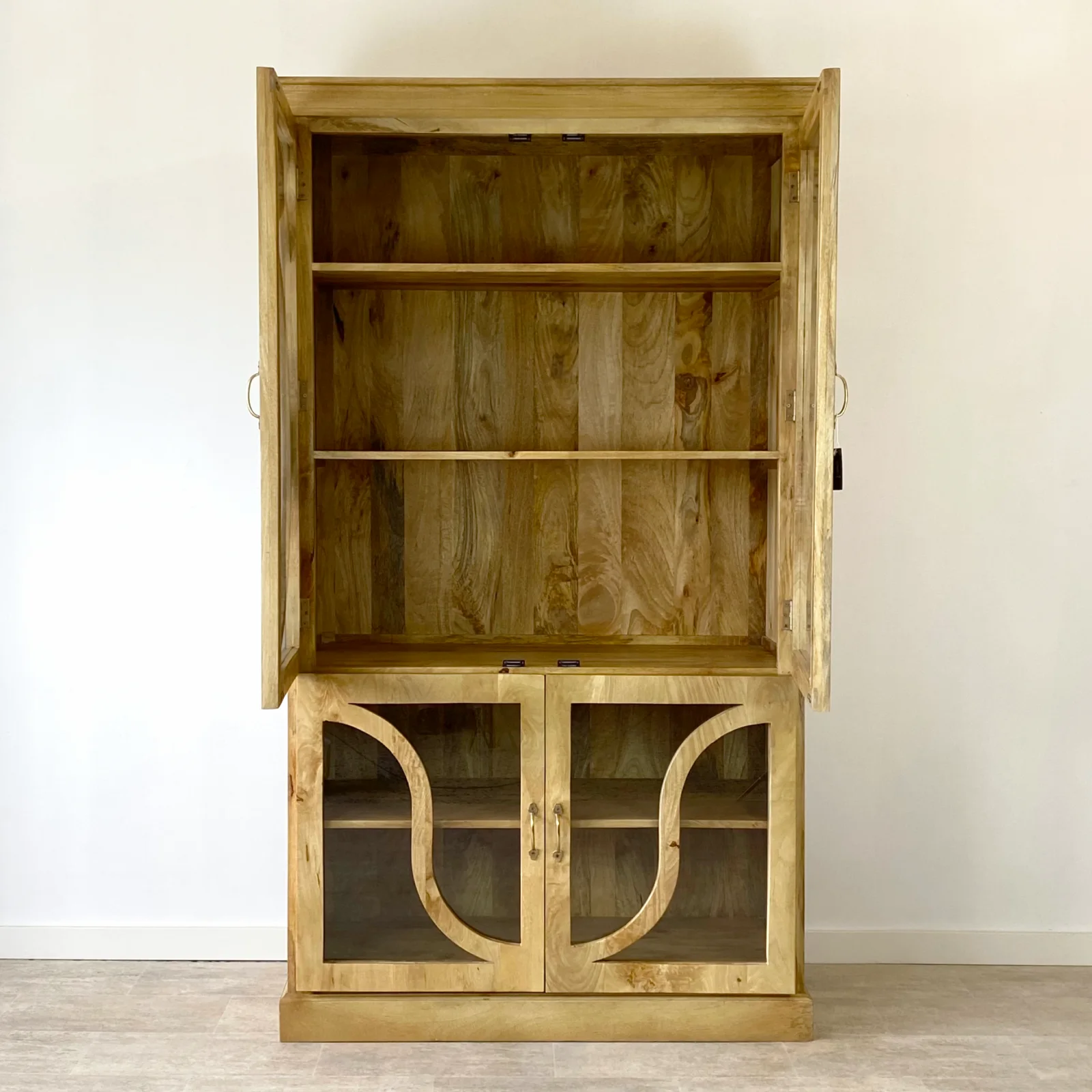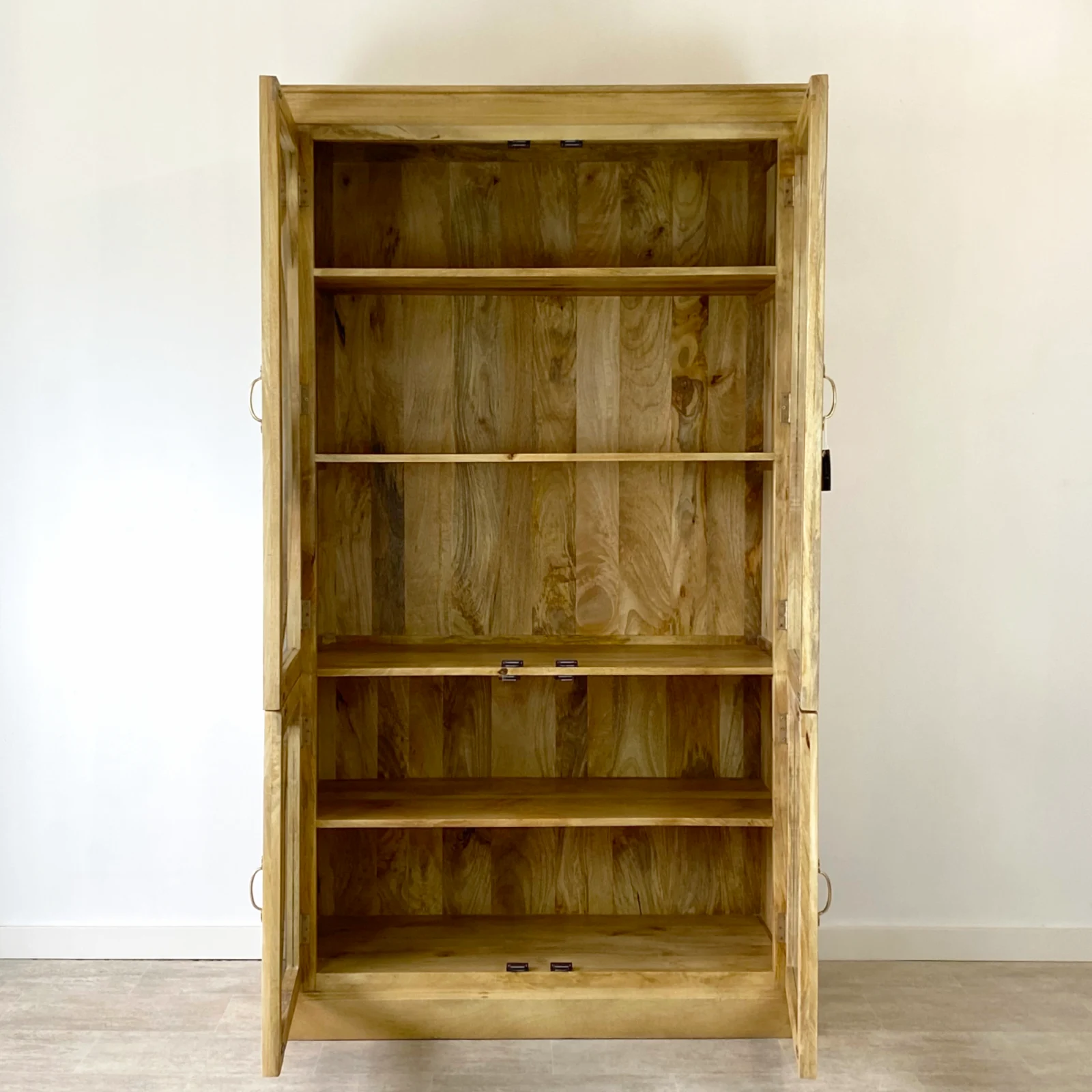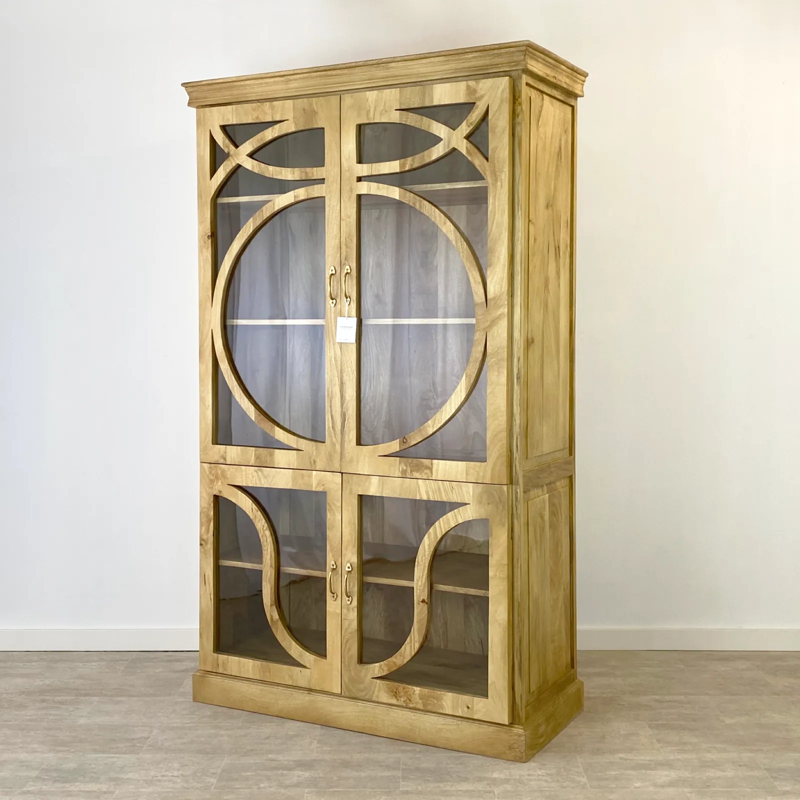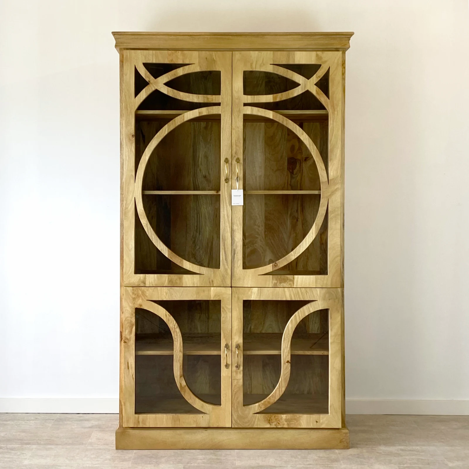 Vitrina 120cm en madera de mango certificada y sostenible tonalidad natural, con 4 puertas acristaladas talladas a mano formando un patrón, y baldas en su interior.